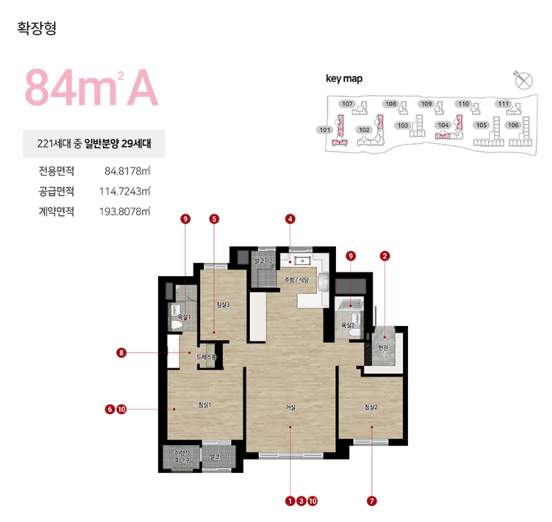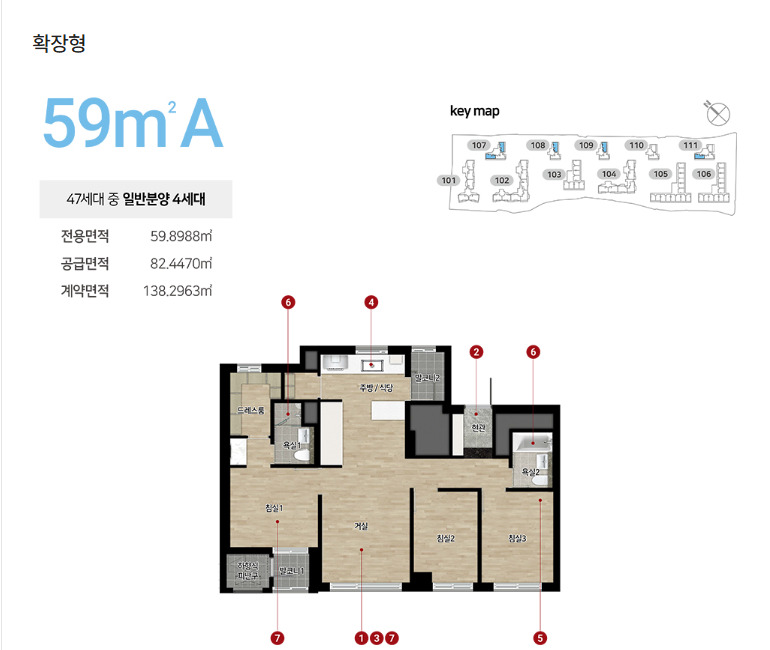 - 전용면적 타입: 44㎡, 49㎡, 59㎡, 74㎡, 84㎡